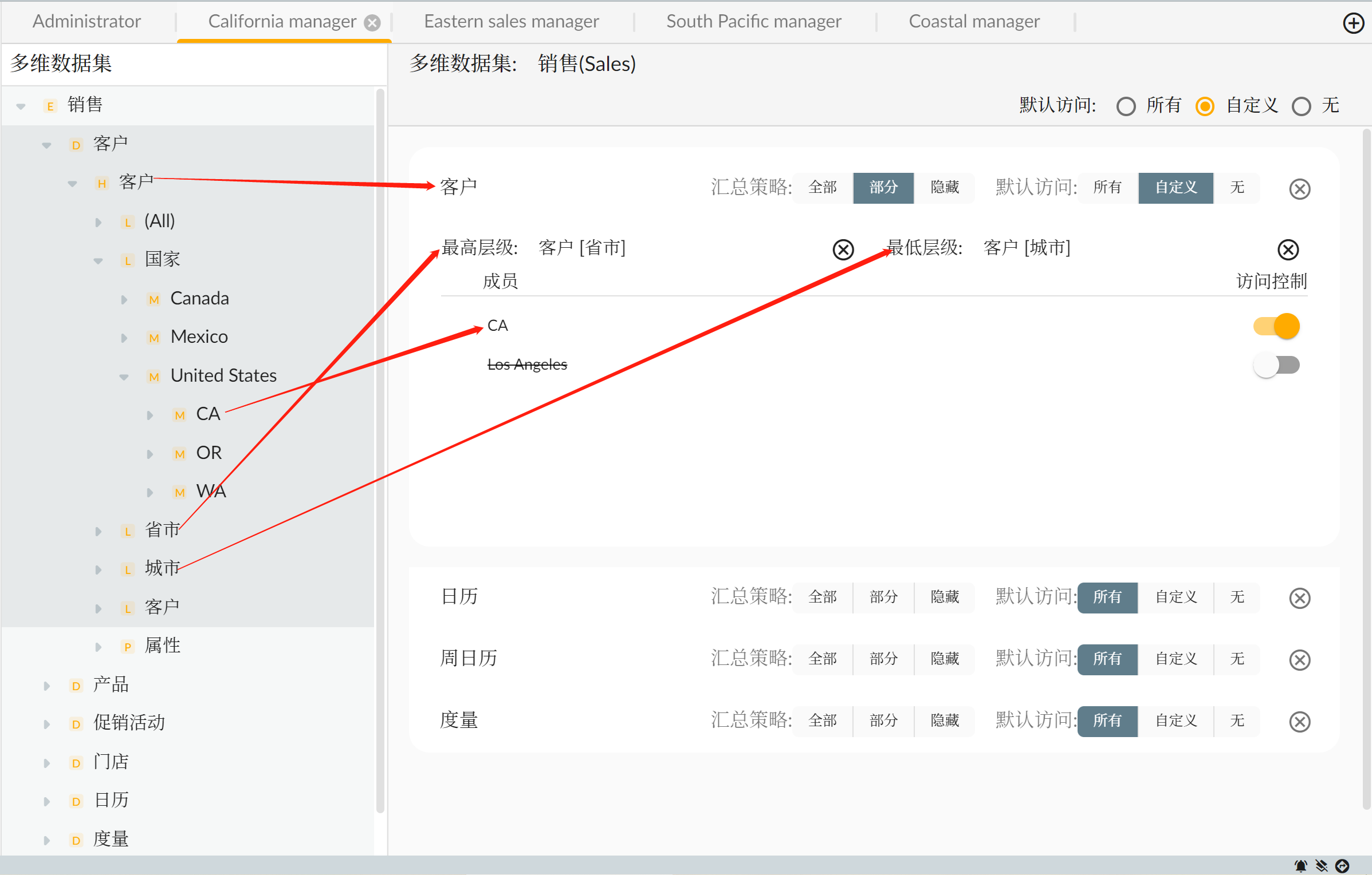 - 如果成员的任何子成员是可见的,则成员是可见的. 假设你无权访问 USA,然后有权访问 California 。你将能够看到 USA 和 California,但不能看到 USA 下的其他州。然而,针对 USA 的汇总数仍然会反映其所有的州。