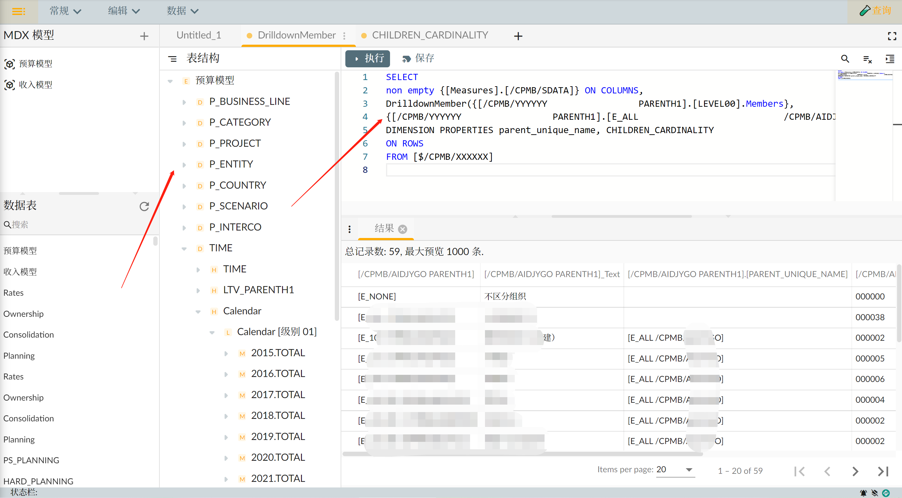 全部这些信息节点都可以拖至右侧编辑器中, 帮助用户进行 MDX 语句的编写.