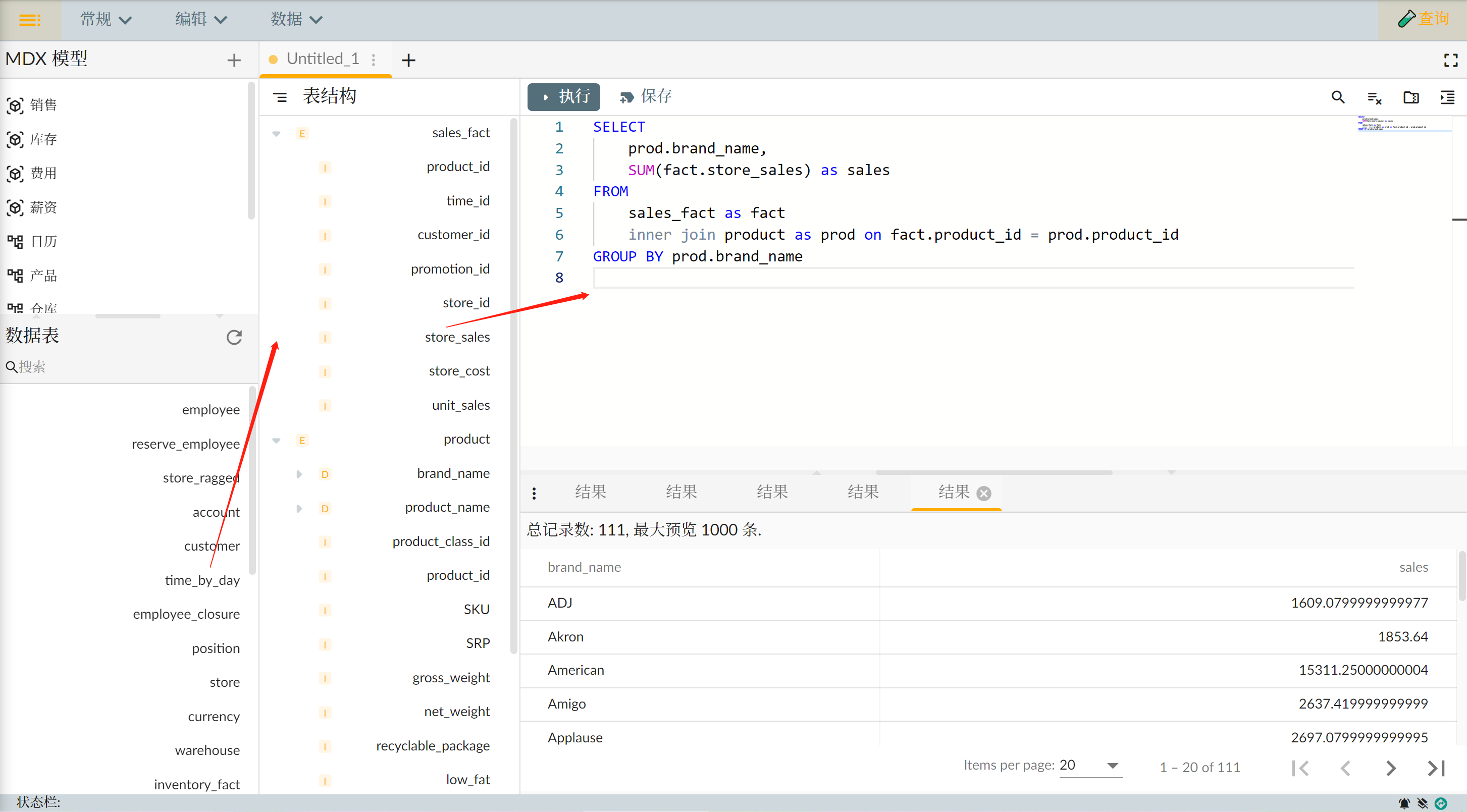 将数据表拖至表结构区域, 可以查询其详细字段信息和成员组成. 将表, 字段或成员拖至代码编辑区域可以插入相应的名称,在查询语句编写完成后, 点击 执行 将执行查询语句并查看数据结果. 将表结构区域内的表或字段拖至查询结果区域可以直接查询相应的数据结果,表名将查询表所有字段的数据,字段名将查询该字段的成员数据。