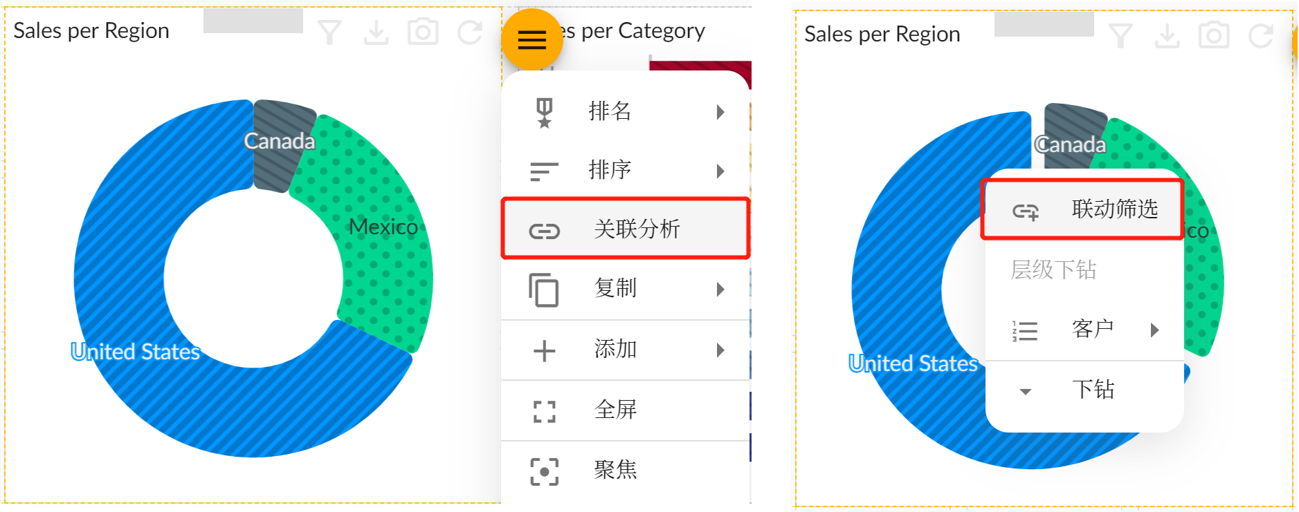 点击图形中的元素, 如果图形有筛选功能的话, 界面会弹出分析菜单. 其中包含有: 联动筛选, 层级下钻, 维度下钻, 下钻 功能选项. 选择联动筛选, 图形组件将发出过滤器对设置的页面上其他组件进行关联过滤.