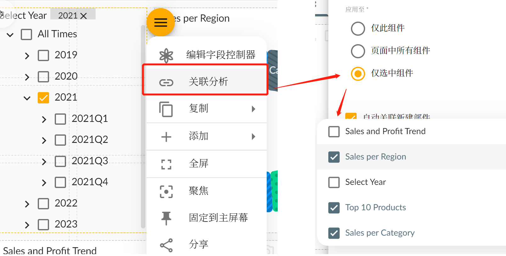 继续选择想要关联的组件列表, 将 Sales and Profit Trend 和 Select Year (此输入控制器本身) 空下.