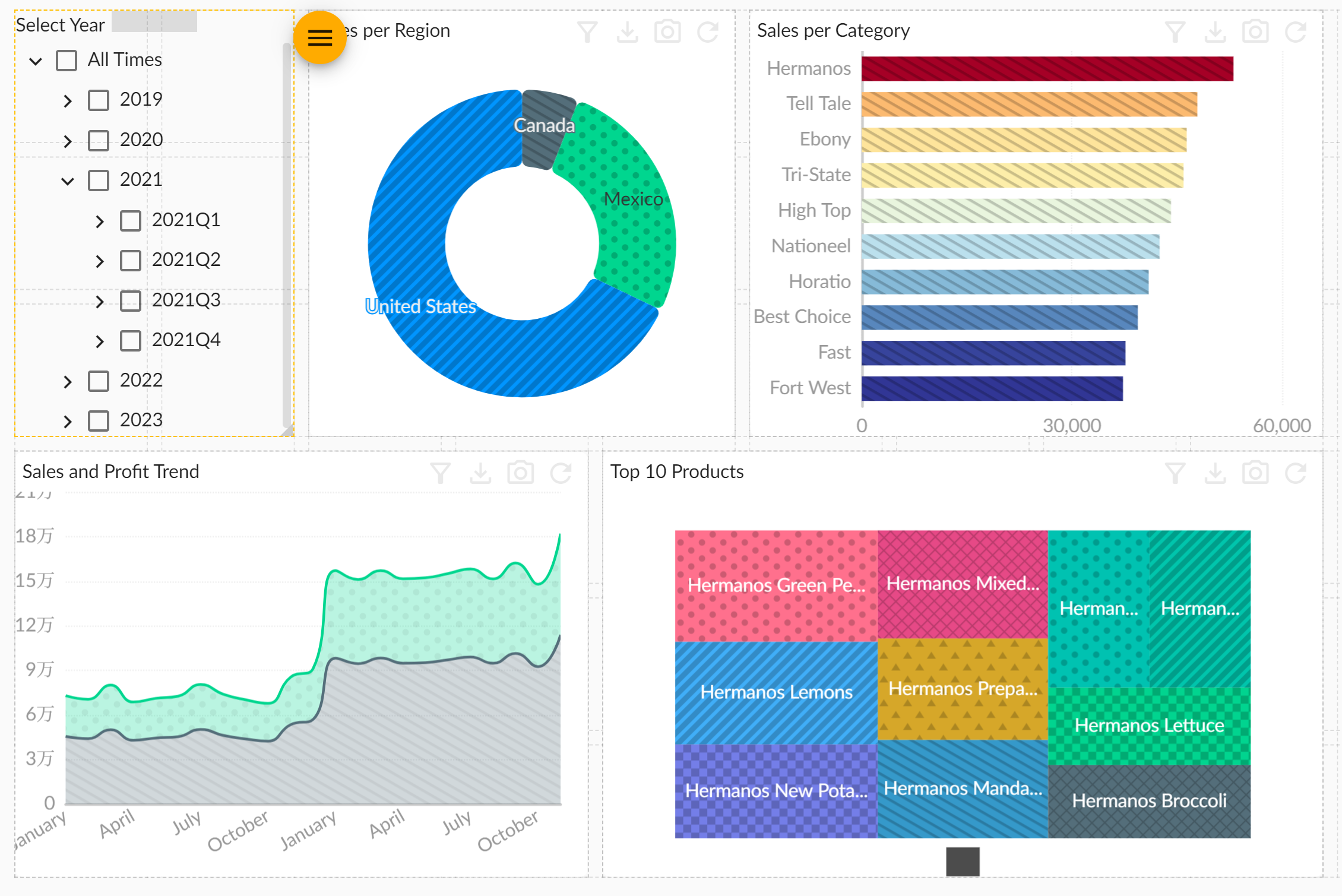 假设一个场景, 我们有一个销售概览的仪表板. 上面有一些对数据分析的图形: Sales per Region, Sales per Category, Sales and Profit Trend, Top 10 Products.
