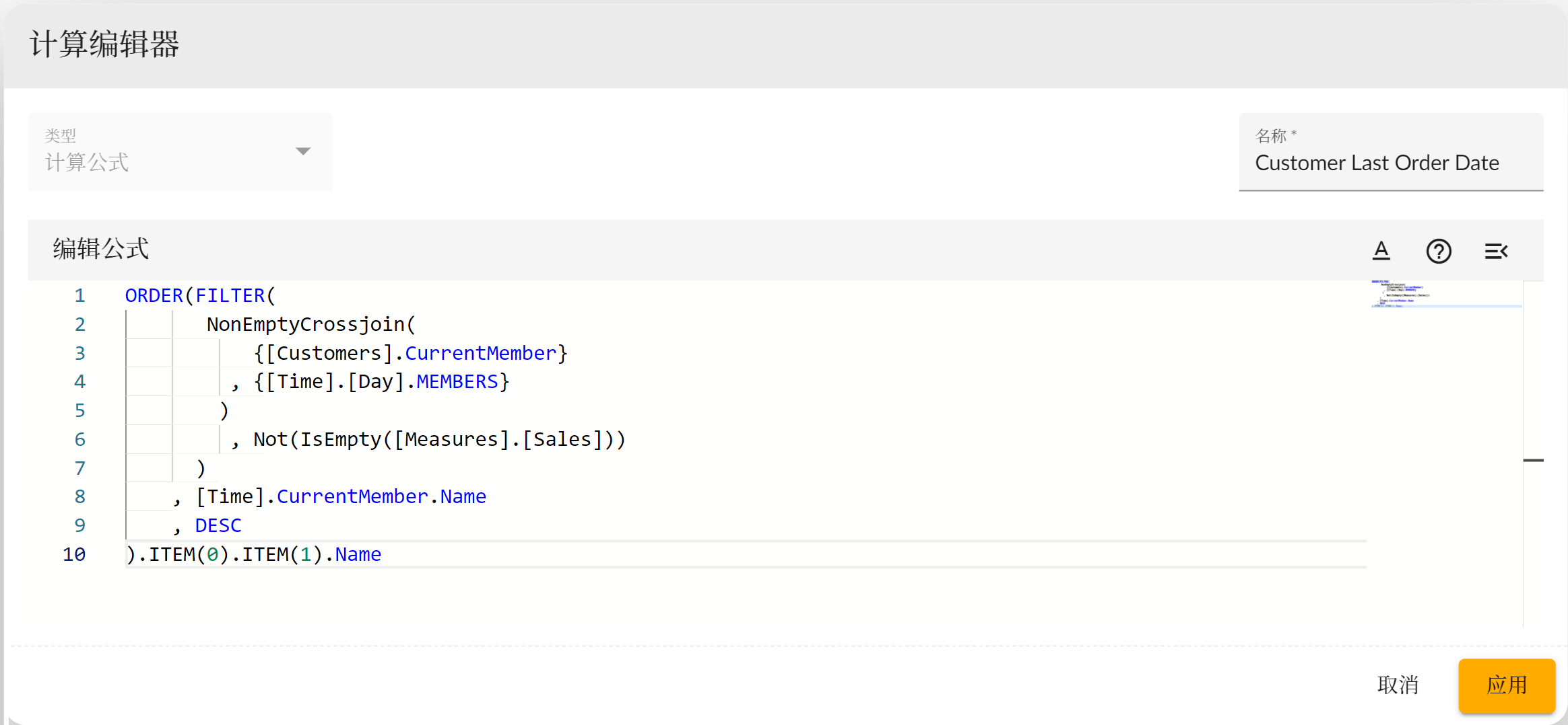 假设我们要计算购买前 10 名的客户并且计算其最后下单日期, 创建客户最后下单日期的计算度量 Customer Last Order Date, 计算公式为: