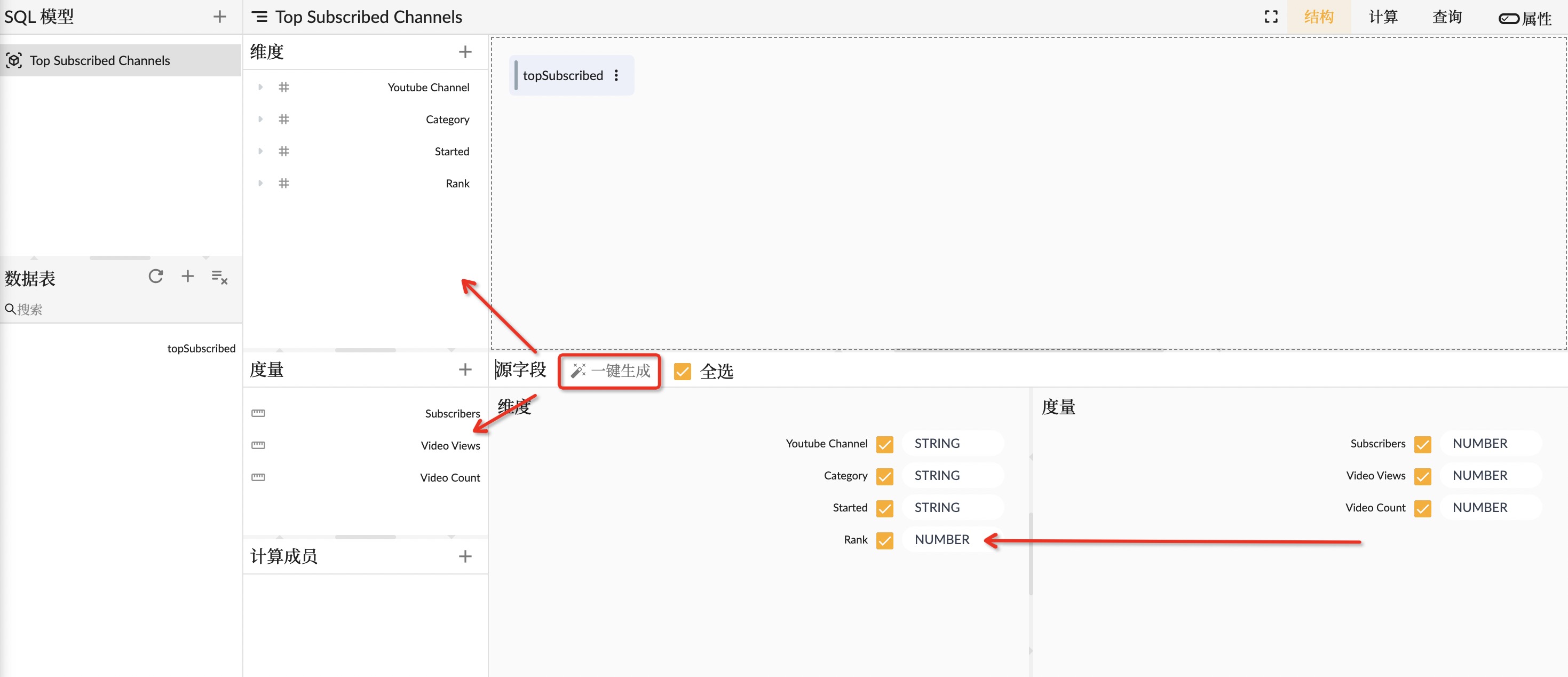 这里 topSubscribed 就是多维数据集的事实表,目前一个多维数据集中支持一个事实表和多个维度表。这里勾选度量或关联维度后创建多维数据集,会自动创建度量和维度结构。也可以不勾选,手动创建。手动创建模式,在源字段区域是事实表的物理表字段,被自动根据字段类型划分为维度和度量,需要调整的可以相互拖动。