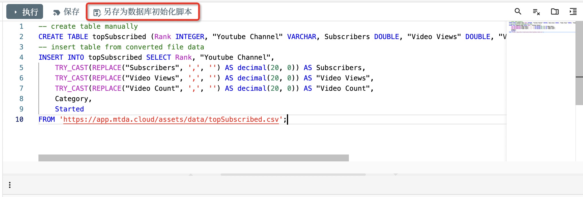 也可以使用数据库初始化脚本的方式加载为数据表,使用如下 sql 脚本