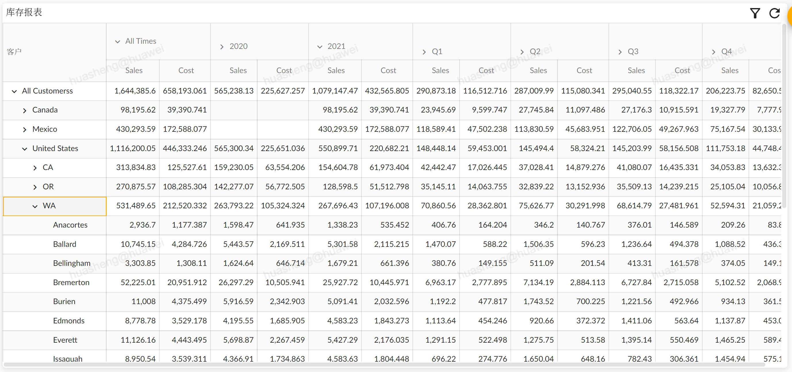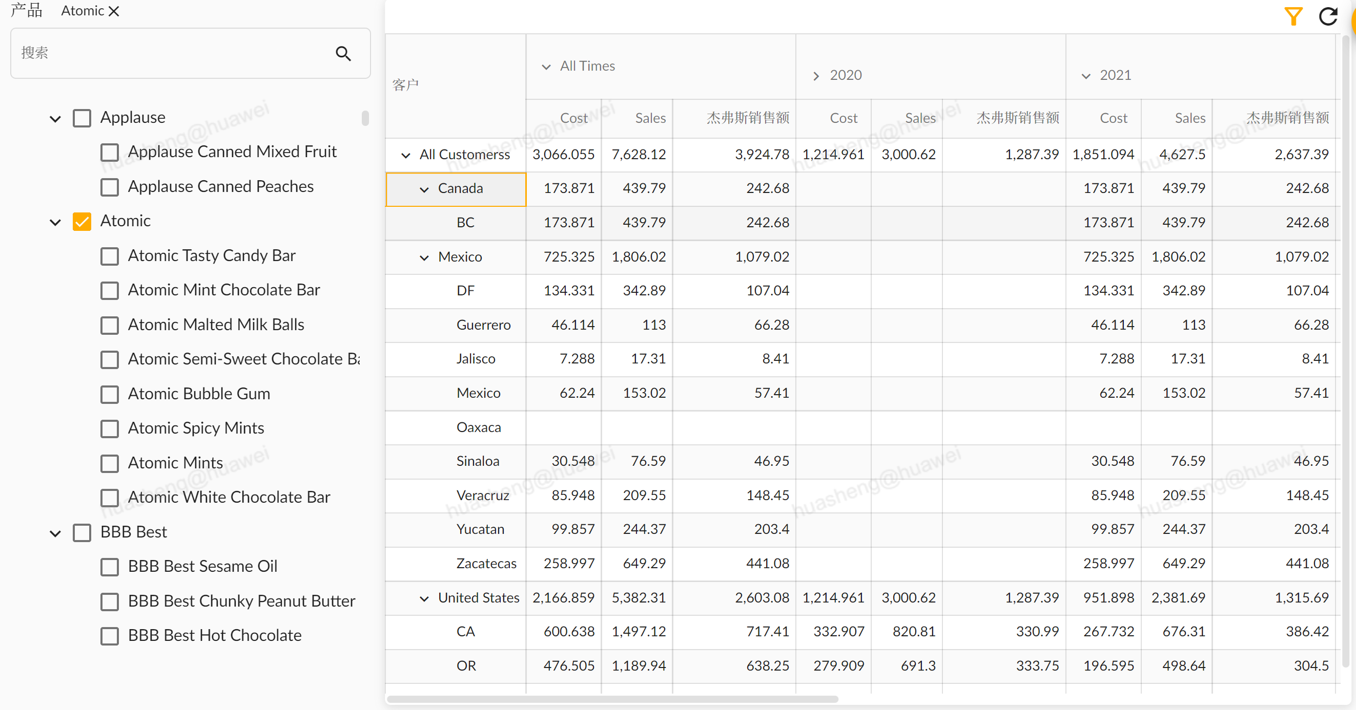 • 行上将首个设置了包含父级层级的维度作为树状结构展示.